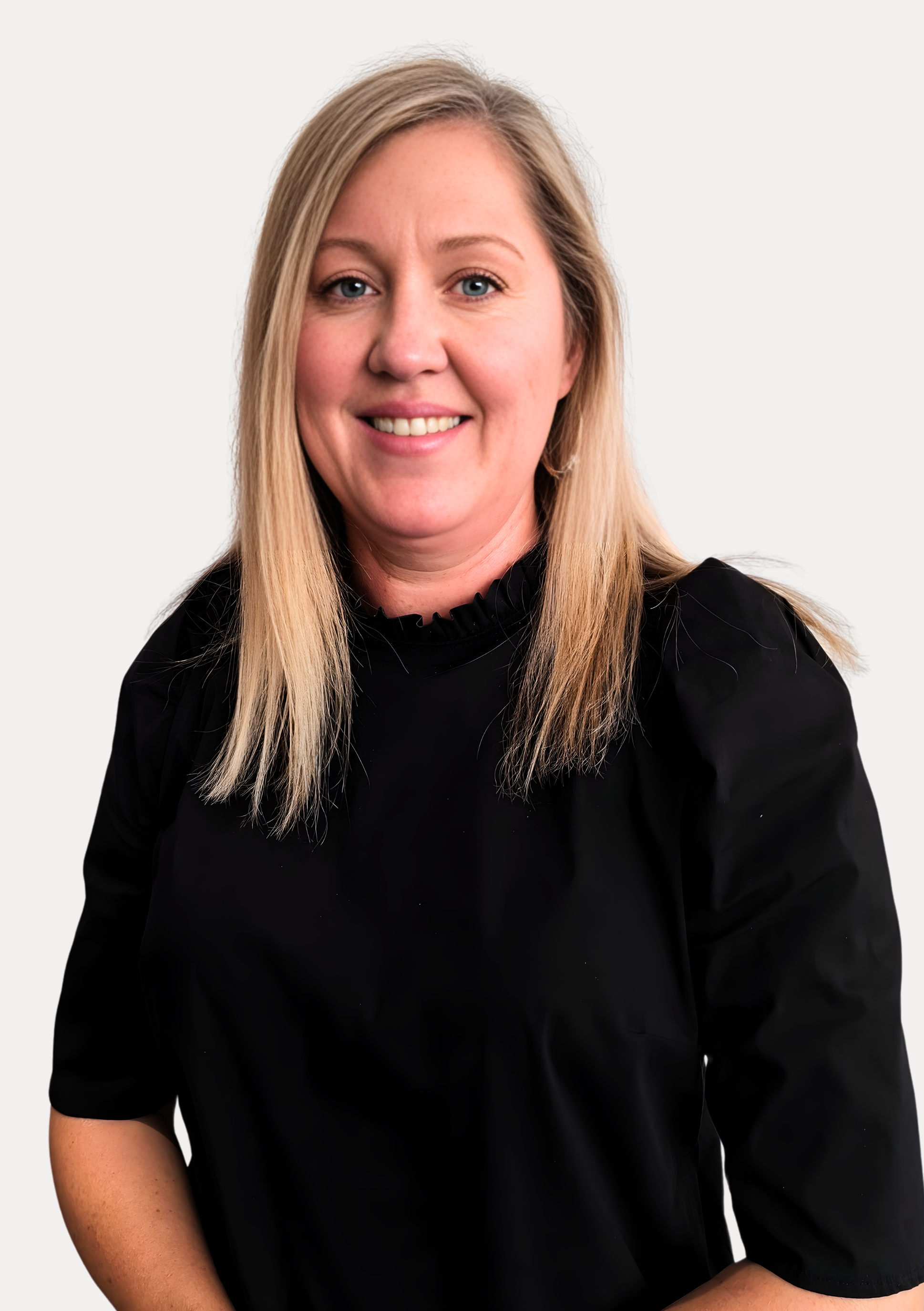 A young woman with shoulder-length brown hair, wearing a black shirt, standing against a plain light background, smiling softly.